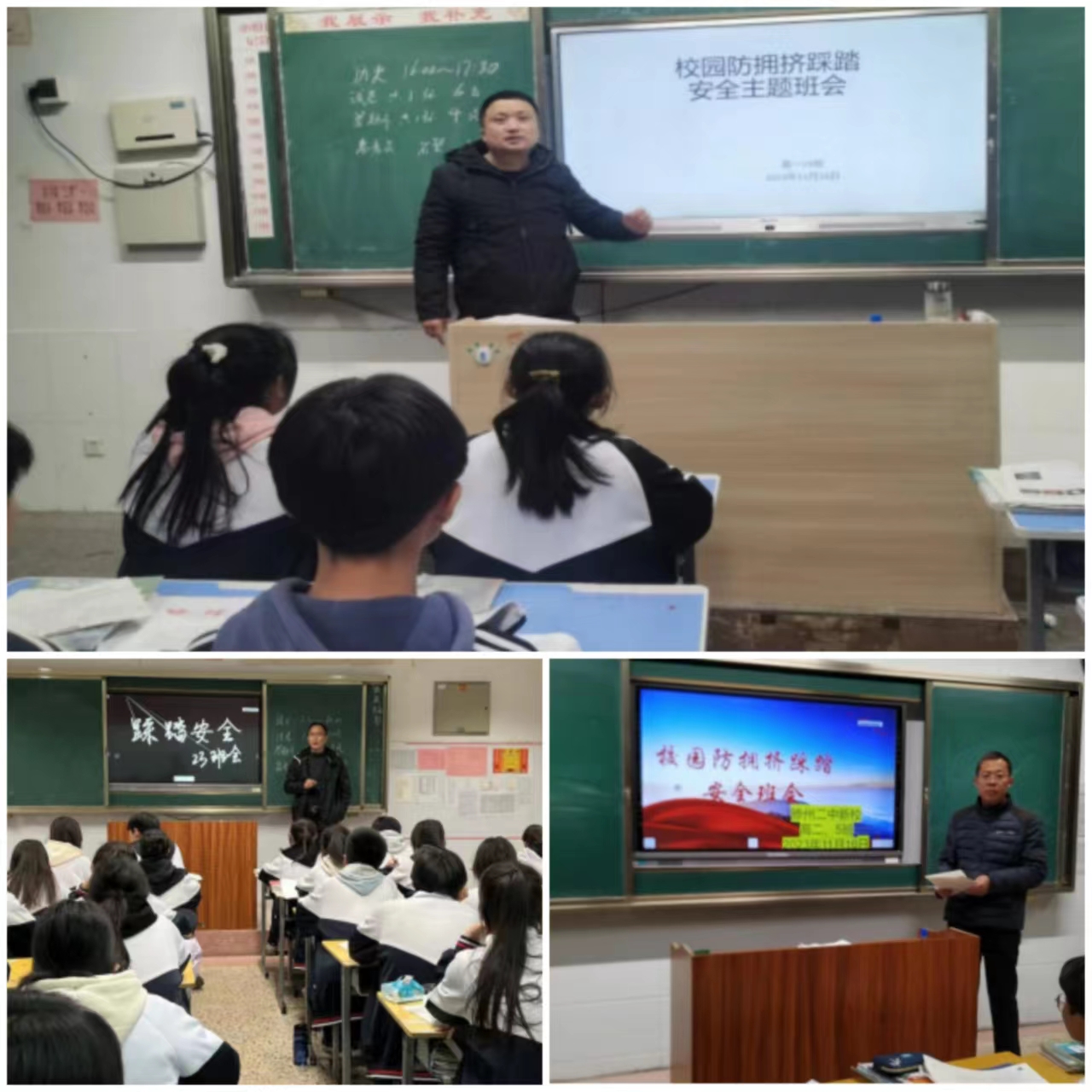 各年级班主任带领学生回顾了近期发生的踩踏事件,并从踩踏事故发生的原因、如何避免踩踏事故以及发生踩踏事故时怎么办这几个方面进行了讲解,有效提高了学生的防踩踏意识。