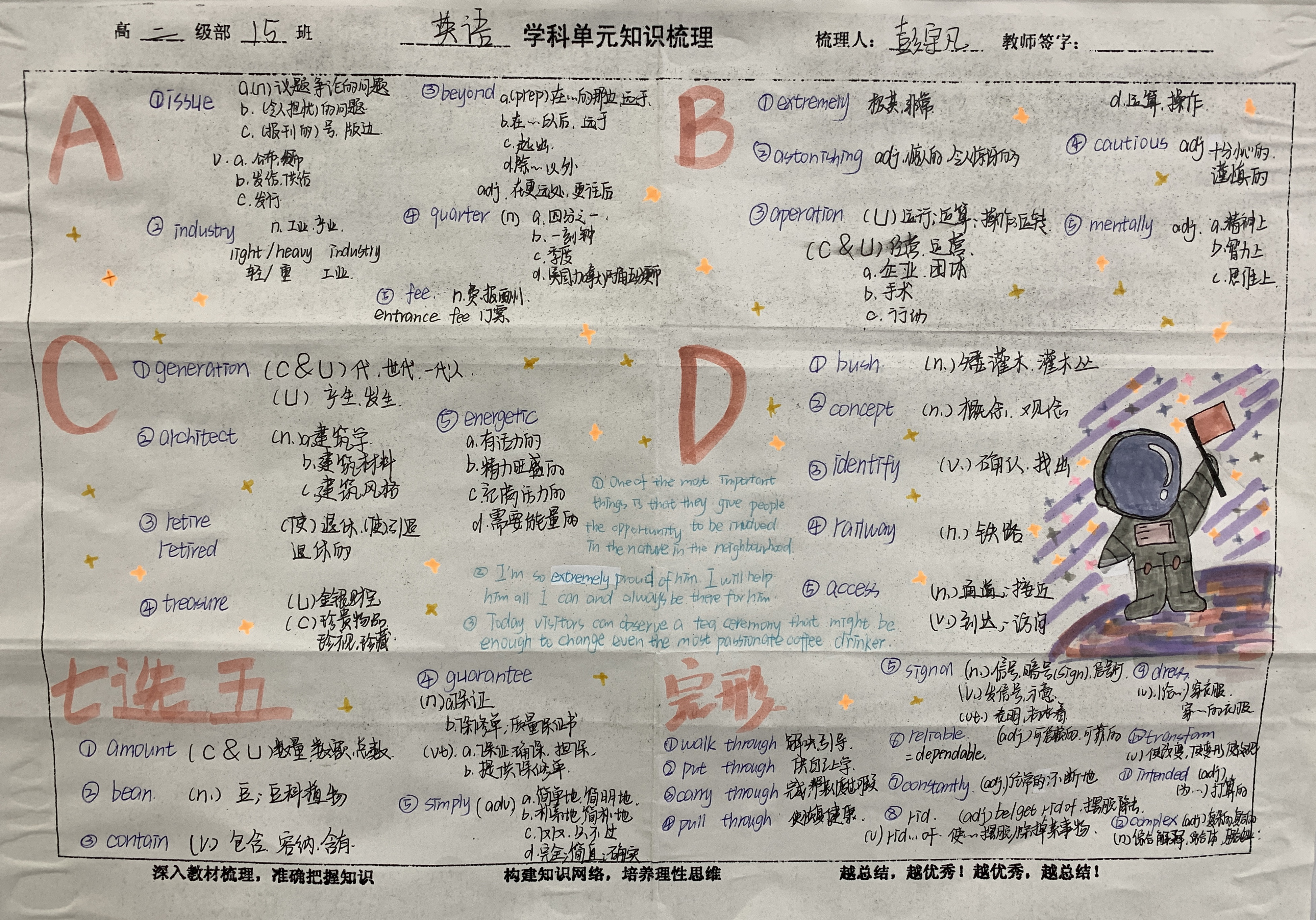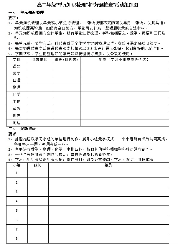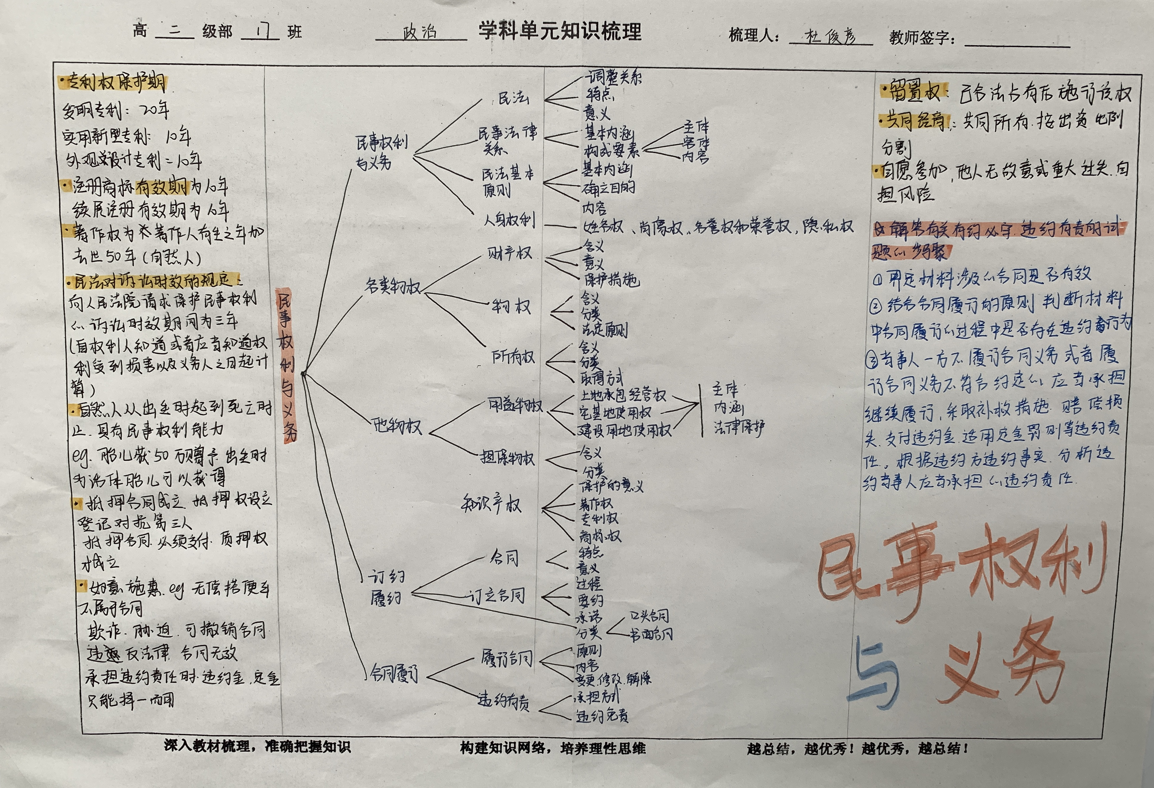 为进一步提升学生高阶思维能力,学校在基础年级开展“单元知识梳理”、“好题推送”、“学科知识竞赛”系列活动。高二级部根据学生情况,设计“单元知识梳理”和“好题推送”活动,高二年级学生积极踊跃参加展示,主动参与,认真进行单元知识梳理,张贴展示,不仅提升了自身对知识点的深度认知,还在学习小组、班级、年级起到良好的示范引领作用。