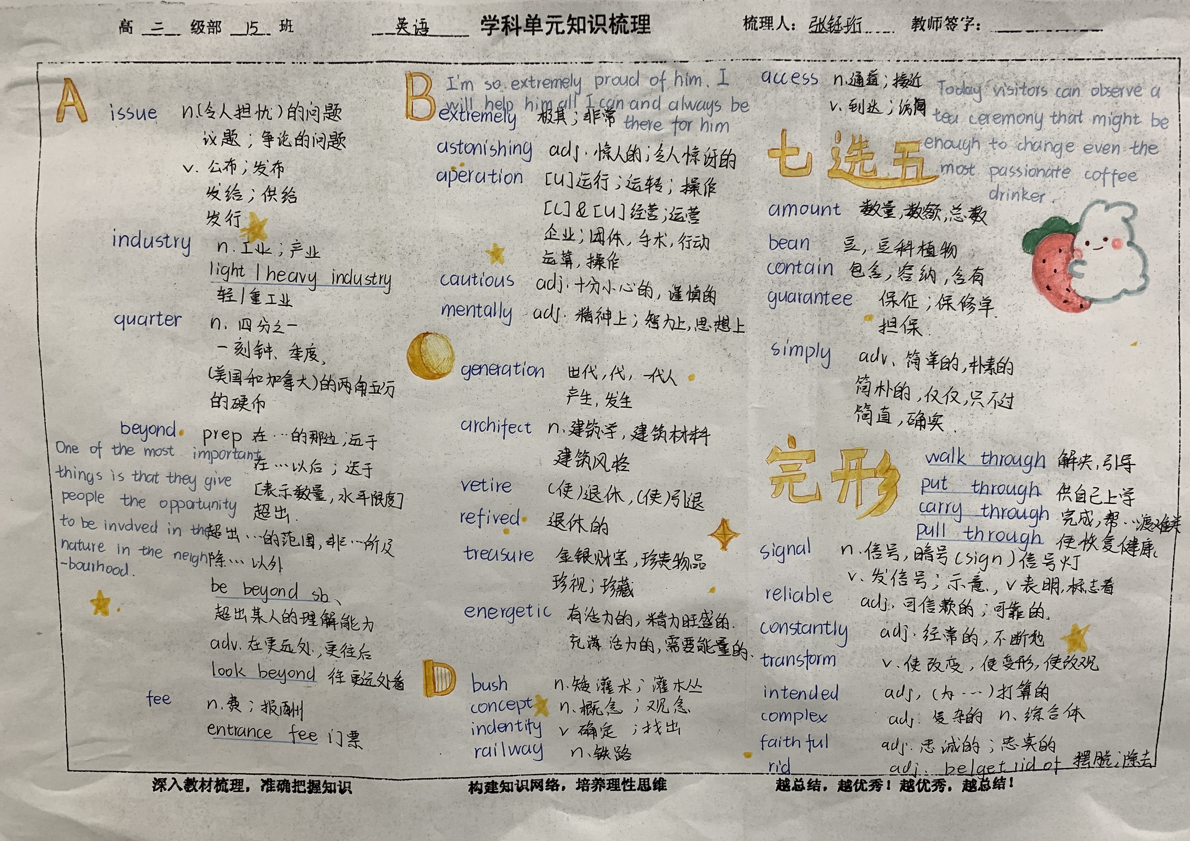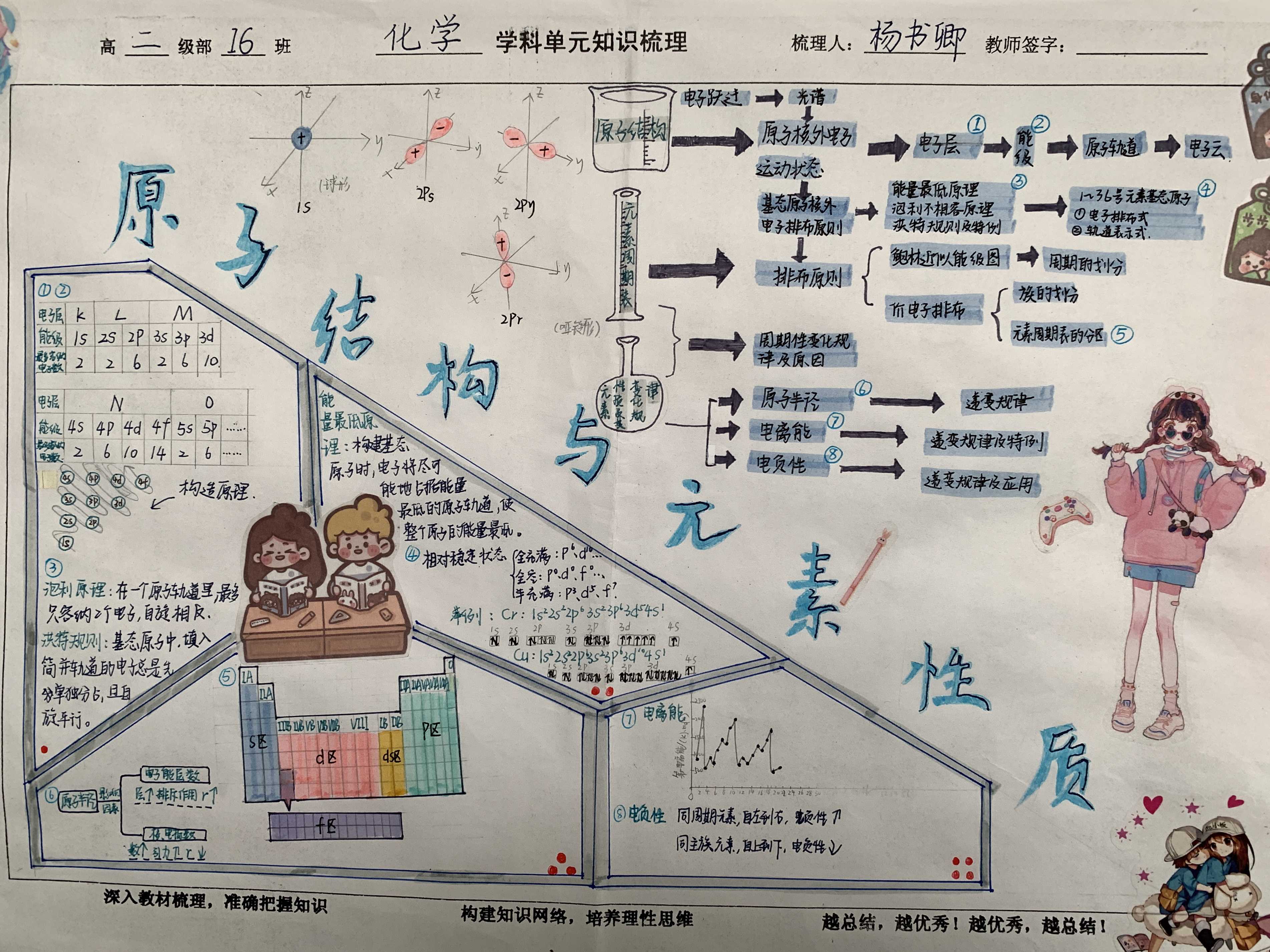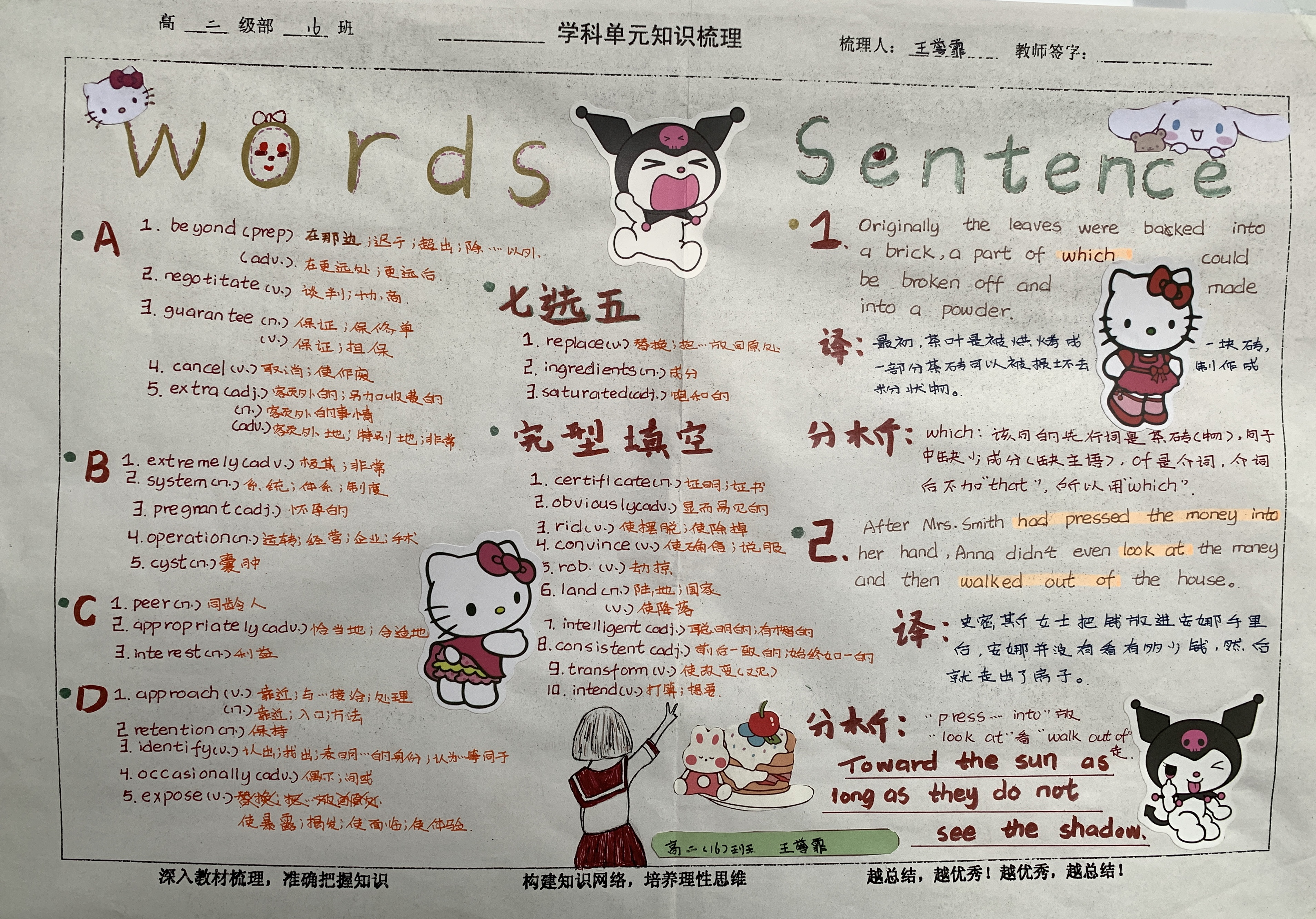 为进一步提升学生高阶思维能力,学校在基础年级开展“单元知识梳理”、“好题推送”、“学科知识竞赛”系列活动。高二级部根据学生情况,设计“单元知识梳理”和“好题推送”活动,高二年级学生积极踊跃参加展示,主动参与,认真进行单元知识梳理,张贴展示,不仅提升了自身对知识点的深度认知,还在学习小组、班级、年级起到良好的示范引领作用。