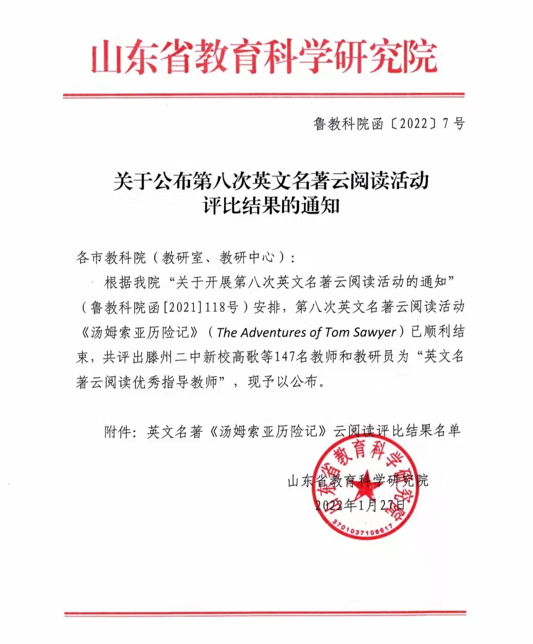 山东省第八次英文名著The Adventures of Tom Sawyer“云阅读”活动于2021年12月31日拉开帷幕,活动采用线下阅读、线上评优、交流展示的方式,每晚在省导读专家的引领下,进行优秀文学圈作业的展示,全省名著阅读指导教师进行线上研讨。本次活动中,我校CRC表现突出,高歌老师代表我校英语团队在2022年1月1日进行了优秀文学圈作业展示,同时推介了我校英语名著阅读教学的阅读成果。这是滕州二中新校英语教研团队第三次在省“云阅读”平台上分享经验。彰显了我校英文名著阅读的实力和毅力,受到全省同仁的普遍关注,增强了我校全体英语教师进行英文名著阅读研究与实践的信心。